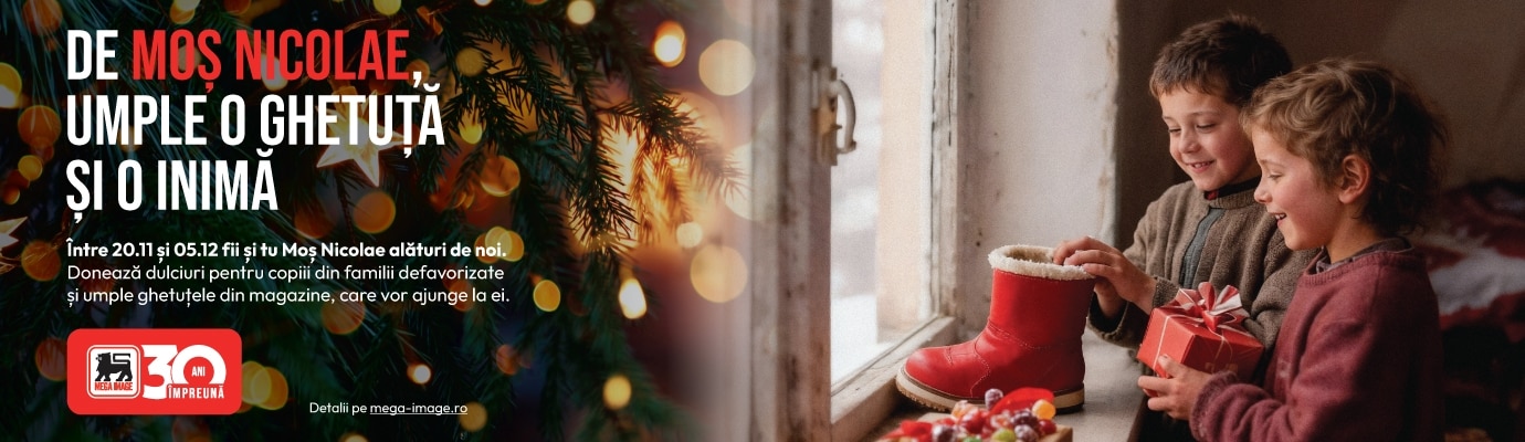 Între 20 noiembrie și 5 decembrie 2025, fii și tu ajutorul moșului alături de noi! Donează dulciuri pentru copiii din familiile defavorizate în ghetuțele pregătite în magazinele Mega Image.
