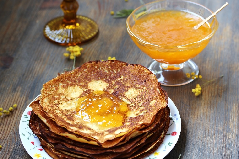 Incinge o tigaie mica antiaderenta. Adauga putin unt pentru a unge fundul acesteia. Toarna cate un polonic de aluat in centrul tigaii si roteste pentru a-l intinde uniform. Gateste 30 de secunde, pana la un minut si intoarce clatita. Scoate-o pe o farfurie si acopera cu un capac pana termini de gatit toate clatitele. Continua pana cand termini aluatul de clatite. Serveste-le cu dulceata de portocale.