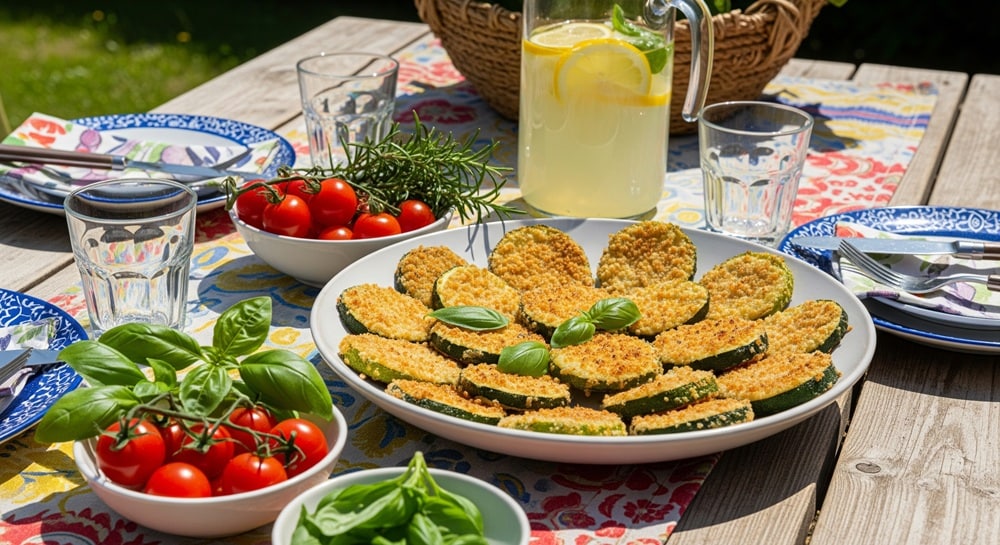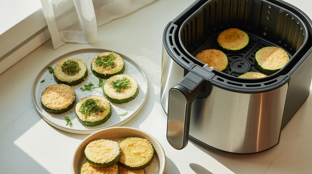 Șnițele de dovlecei la air fryer: Prepară feliile ca pentru cuptor, apoi gătește-le în air fryer la 190°C pentru 10-15 minute, până devin crocante.
