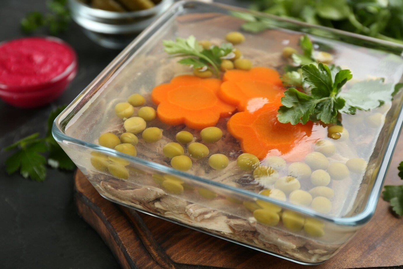 Ca să pui în valoare decorul și să-l separi vizual de partea cu carne, toarnă peste el un strat de aspic de aproximativ 1 cm. După ce acesta s-a întărit la frigider, treci la următoarea etapă;