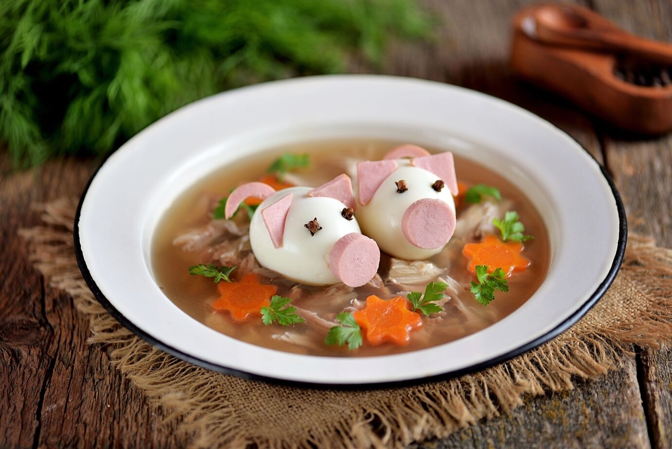Ouăle fierte, legumele (morcovi fierți, mazăre blanșată, pătrunjel sau rondele de ceapă), sunt opțiuni excelente pentru decor. Acestea pot fi tăiate în forme geometrice;
