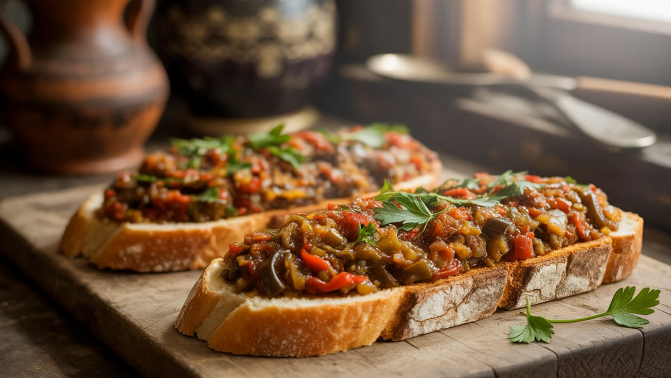 Zacusca este completă abia atunci când o savurezi pe o felie de pâine caldă și crocantă.